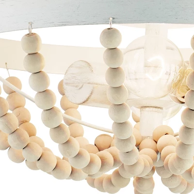 Light your interiors while adding some glam vintage Bohemian vibes to the 15″ Delilah Boho Semi-Flush Mount Ceiling Fixture from River of Goods. Combining a brushed white metal frame and charming wooden bead accents, this semi-flush mount hanging lamp makes a great choice for overhead lighting in the center of your living room, above your dining table or even in a hallway. The light hardwires into your ceiling for a clean, integrated look, and the mixed materials combining matte metal and beige wooden beads bring coastal-inspired style to your decor. This ceiling-mount lamp uses two E26 60-watt maximum or compatible LED bulbs, and is designed for indoor use only.
