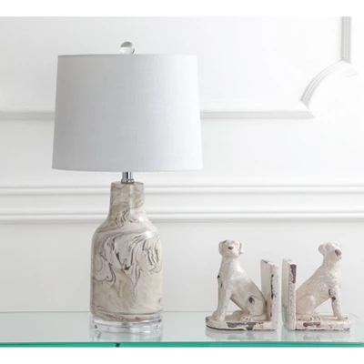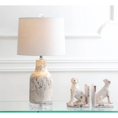 This hand-thrown ceramic table lamp immediately draws the eye with its swirling marble pattern in gray and white. A hardback linen drum shade with hand-rolled edges, crystal pedestal, and clear finial finishes the piece in style. You’ll love the silk-wrapped cord, which is too beautiful to hide!. Glazed in a marble design, the hand-finished effect adds eye-catching style to this classic shape. 100% cotton hardback round shade. 60 silk cord with standard USA 2-prong plug. On-off switch on socket. Takes one maximum 60 watt or equivalent bulb. Eco-friendly 9W LED bulb included. UL Listed. Before cleaning any lamp shade or fixture, disconnect the power source. Wipe with a soft, dry cloth. Avoid the use of chemicals and household cleaners as they may damage the finish.