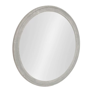 Make a sophisticated statement with the beautiful transitional style of the Kate and Laurel Mansell decorative wall mirror. The round circular shaped glass mirror is bordered by a well-built, elegant, ornamental frame. Its charming, distressed gray finish features a sloped transitional style and is made of a durable, textured man-made wood. Hang it proudly over your vanity, dresser, shelf or hang it as an accent piece in the living room, dining room, family room, or bedroom. The shape will be a great way to break up the straight lines of a gallery display or just the right size for smaller wall space. No matter the setting, it is sure to add warm, charming visual appeal. The outside diameter of this round mirror is 28 inches. The actual mirror is 24 inches in diameter. Two hangers come installed on the back and are elbow D-Ring type, keeping the mirror flat and secure against a wall.