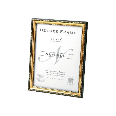 Deluxe Frame, 8-1/2″x11″, Gold Trim Display letters of commendation, diplomas, awards and photographs in a distinguished gold molded frame with a glass face. Back removes easily for document insertion. Hanger designed for vertical or horizontal display. 8-1/2×11″ frame size. Gold frame is made of molded styrene/plastic. Deluxe frame features back that removes easily for document insertion. Quality plastic face. Sold as 1 Each.