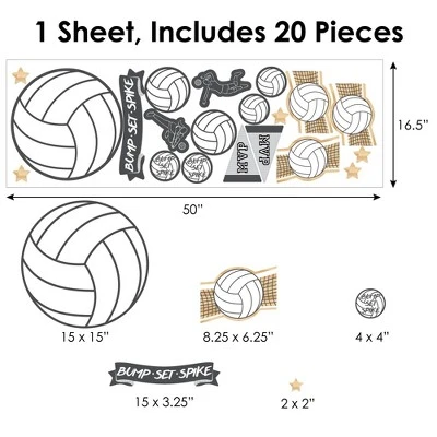Big Dot of Happiness Bump, Set, Spike – Volleyball Wall Decals includes 1 sheet of 20 assorted vinyl wall art stickers that you can arrange to add a special touch to your home decor. Wall Decal sheet measures 50” wide by 16.5” tall. Pieces range in size from 15 x 9.5” to 2.75 x 2.75”. Effortless Decor: The Sports Decor wall stickers are an easy solution for bringing in some added charm to your space within minutes! You can use the wall decals for rooms, impressive photo backdrops, or as easy decor at your Baby Shower or Birthday Party. Easy to Use: Bump, Set, Spike – Volleyball vinyl decals are easy-to-peel and repositionable. Wall art stickers will adhere to various surfaces including painted walls, plastic, wood, glass, and metal. To use, make sure your surface is clean and dry. Slowly peel the sticker from the paper to avoid tearing and smooth over with your hand. They are also easy to remove, leaving no residue. High-Quality Supply: Bump, Set, Spike – Volleyball wall stickers come with a quality matte finish and vibrant colors. They are printed on water-resistant professional quality material and will arrive on one full sheet rolled. Made In The USA: Sports Decor Wall Decals are designed and manufactured at our Wisconsin facility using materials that are Made in the USA.