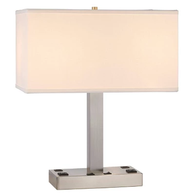 Cal Lighting’s Colmar Modern styled metal desk lamp is 20.5′ tall and features with 2 grounded power outlets and 2 USB charging ports. this lamp uses 2 60 watt bulbs (not included). Two rocker switches on the base. Hardback shade included. Brush Steel finish. This lamp will be a great addition to your office area, end table, or night stand.