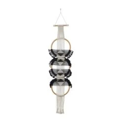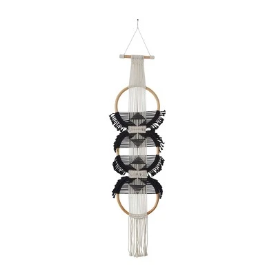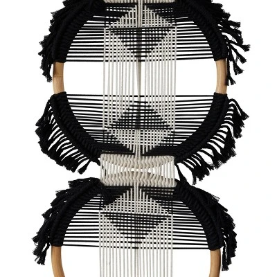 - Black and white hanging macrame wall decor featuring a round structure with woven cotton details, dangling rope accents, and geometric design in the middle