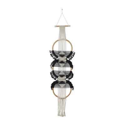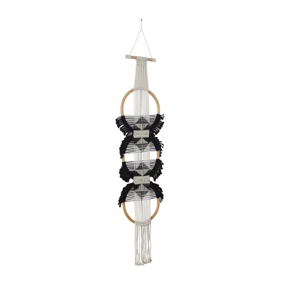 Maximize your open wall space with this eye catching wall decor. An extravagant display in a captivating design to elevate the look of your home. Instantly add a beautiful bohemian vibe to your room with this black and white round macrame wall decor that you can easily hang anywhere. This item ships in 1 carton. Cotton wall decor makes a great gift for any occasion. Due to the handmade nature of these, there will be slight color, shape, and size variations, as well as loose fibers. Can be hung vertically using the cotton cord; nails and screws not included. Suitable for indoor use only. This item ships fully assembled in one piece. Made in Indonesia. This is a single black colored wall sculptures. Bohemian style.