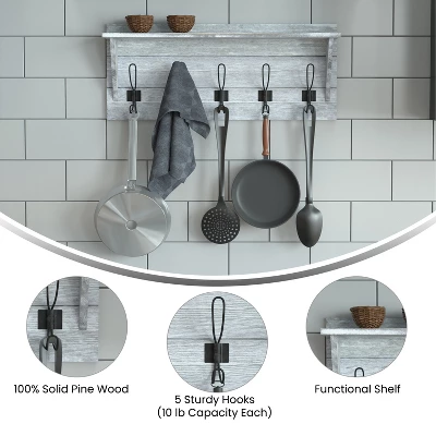 Rustic style meets modern functionality in this country style entryway shelf. Thoughtfully crafted from solid wood for reliable strength and finished in a beautiful whitewashed, this wall-mounted coat rack shelf is perfect for any room in any home. Five rustic hooks are designed with added space between them to give you maximum hanging space for coats, scarves, keyrings, leashes and more. The 24″ shelf is perfect for candles, houseplants, photos and more adding a creative element to this beautiful shelf. The inlaid hanging hardware and included screws and wall anchors make setting up your new shelf hassle free for immediate enjoyment. Add to your kitchen for utensils and spices, mud room for raincoats and umbrellas or anywhere else in your home for organization and style.