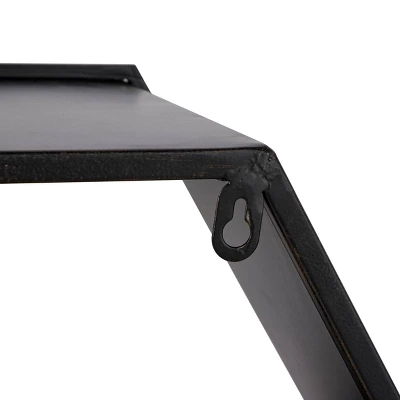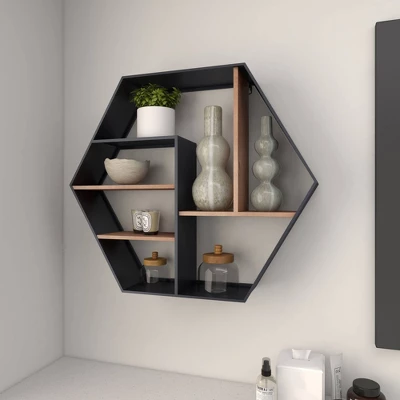 Organize and decorate in style with this black and brown hexagon wall shelf that would easily complement your industrial-themed home space. This item ships in 1 carton. Can be hung horizontally using the keyholes on the back; nails and screws not included. Suitable for indoor use only. This item ships fully assembled in one piece. Maximum weight limit is 20 lbs. This is a single black colored floating shelf. Fir wall shelf features 5 shelves. Industrial style.