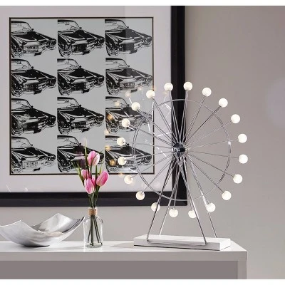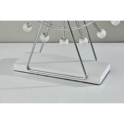 The Coney Large LED Ferris Wheel Lamp can be both a fun, unique accent for your home and an efficient source of ambient lighting. The .5W integrated LED frosted acrylic globe shades light up with a warm glow and rotate simulating the motion of a real ferris wheel. This lamp is available in a small and a large size. The small size is 15.25” high & 12” wide with 12 globe shades. The large size is 22” high & 18” wide with 20 globe shades. Perfect for a kids room or to add a fun accent to a bookshelf or living space!