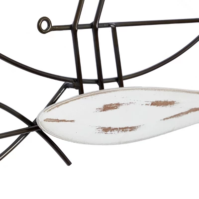 - This open-style wall art features various-sized fishes in a mix of wood and metal sculptures swimming together in one direction
