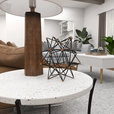 This black geometric metal orb will add modern texture with gilded shine to your tabletops and shelve. The abstract star sculpture features welded iron bars forming a dimensional geometric orb with textured metallic gold accents. The lightweight, simple design, reminiscent of Scandinavian decor himmeli sculptures, work wonderfully as eye-catching shelf decor or table decor anywhere needing artistic filler and movement. This item is shipped in one carton. Suitable for indoor use only. Modern Design.