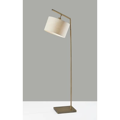 The Reynolds floor lamp illuminates any space with its simple, geometric architecture that suits contemporary, mid-century modern, or industrial styles. At 61″ tall and with a thin, compact design, this lamp fits perfectly behind or beside furniture. The lamp features a rectangular antique brass base supporting a long and thin matching stem. The top of the stem angles to support a 13″ diameter x 8″ tall drum shade made of textured white fabric to softly diffuse the light from a 100W bulb (not included). Easily turn the lamp on or off with a rotary socket switch. Complete your space’s décor with the coordinating Reynolds table lamp.