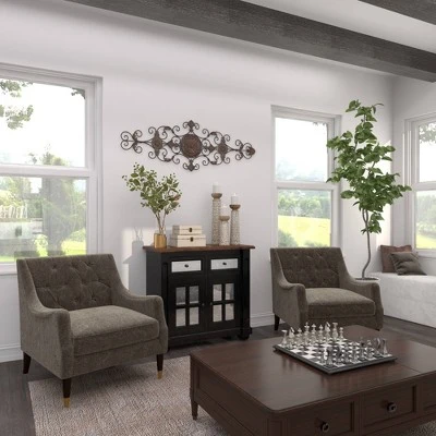 Hang this metal wall decor above a door or end table, or hang it parallel to a window or bookcase. This item ships in 1 carton. Full metal frame is designed with ornate detailed scrollwork. Can be hung horizontally or vertically using the keyholes on the back; nails and screws not included. Suitable for indoor use only. This item ships fully assembled in one piece. This is a single brown colored wall sculptures. Rustic style.