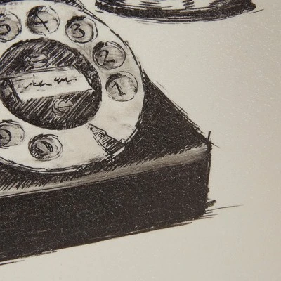 - Fun printed designs of a Rotary phone, antique typewriter, and vintage radio imagery in black on a neutral ground for contrast