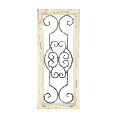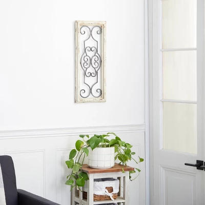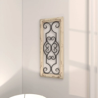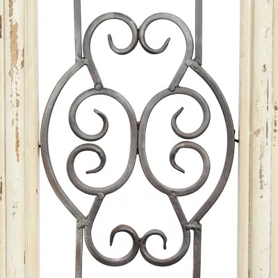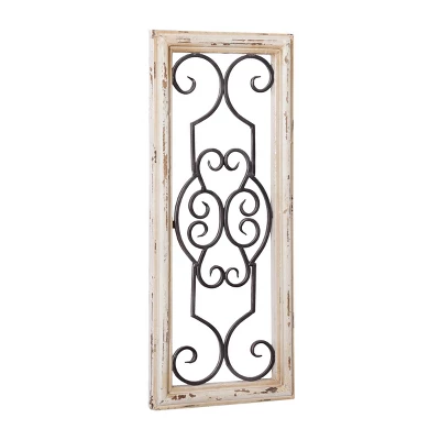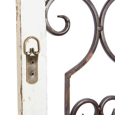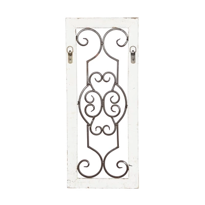 - Features a distressed white rectangular frame with beveled edges and chipping detailing, and intricate iron scrollwork center design in tarnished black finish