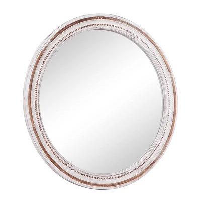 - •This large round wall mirror features a distressed white wooden finish and a reflective glass finish